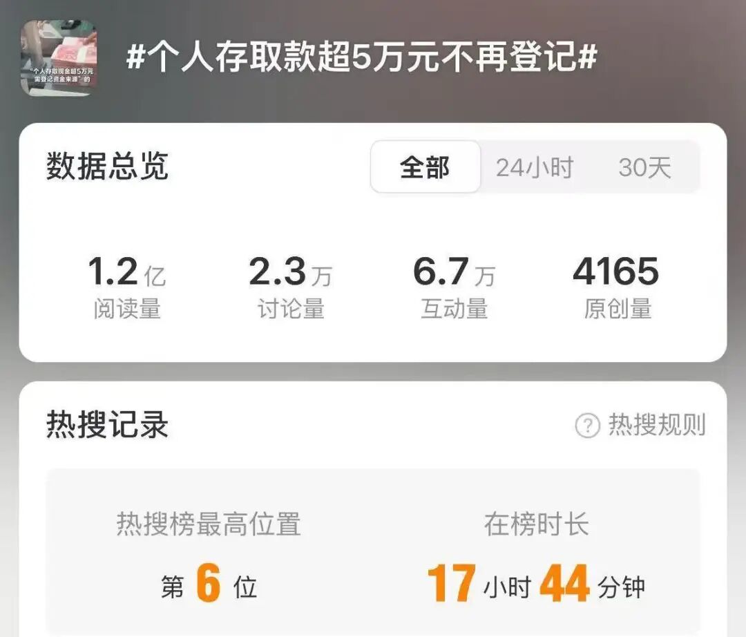 “个人存取款超5万元不再登记”话题